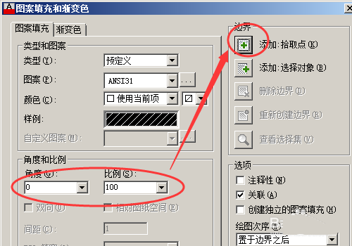 4、在返回的圖案填充和漸變色中我們設置比例(也可在填充后設置)。然后我們點擊邊界下的拾取點。