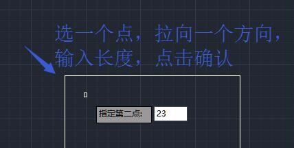 2、選一個點,拉向一個方向,輸入長度,點擊確認;(我輸入的墻體是23cm)我拉動的方向一般是北往南拉,垂直下來;