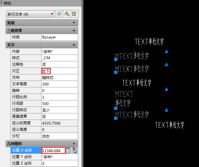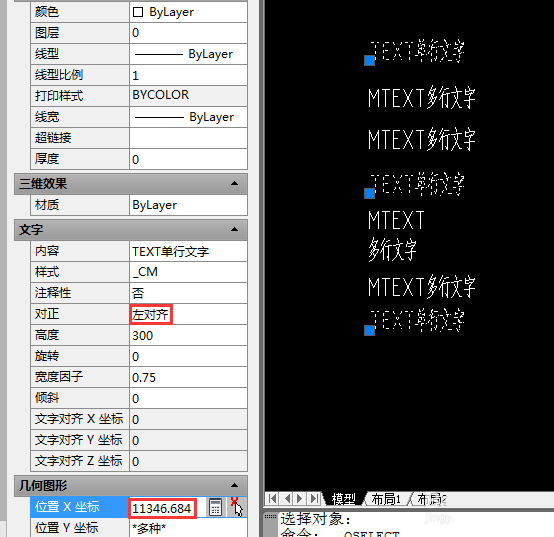 3、此時(shí),所有的多行文字都被選定,由于選集對(duì)象都為同一種,該選集的X坐標(biāo)顯示出來,在確認(rèn)其對(duì)齊方式為左下(左上、左中也可以,目的是確認(rèn)最左側(cè))后,選中X坐標(biāo),Ctrl+V,將先前放入內(nèi)存的X坐標(biāo)值粘貼進(jìn)來,所有多行文字都按照要求左對(duì)齊了。