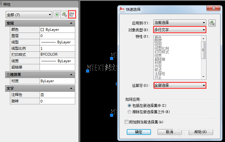 2、選取全部文字對(duì)象(也可以分別選取多行文字或單行文字,當(dāng)文字?jǐn)?shù)量較大時(shí)會(huì)顯得比較麻煩),在特性對(duì)話中點(diǎn)擊”快速選擇“圖標(biāo)。如圖在”快速選擇“對(duì)話框中分別設(shè)定”多行文字“和”全部選擇“選項(xiàng),然后點(diǎn)擊”確定“。
