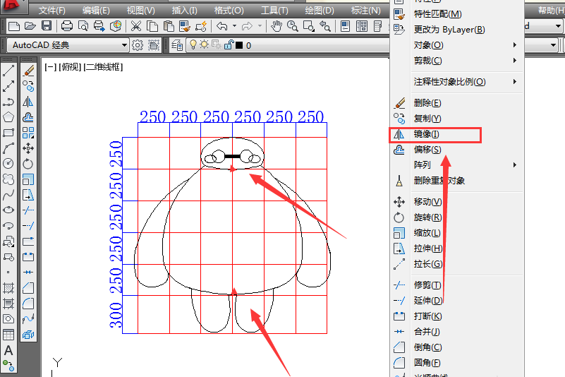 8、鏡像完成身體另一半。點擊上方修改,點擊鏡像,選擇所需要鏡像的對象,再點擊中間兩點作為鏡子,選擇不刪除源對象即可。