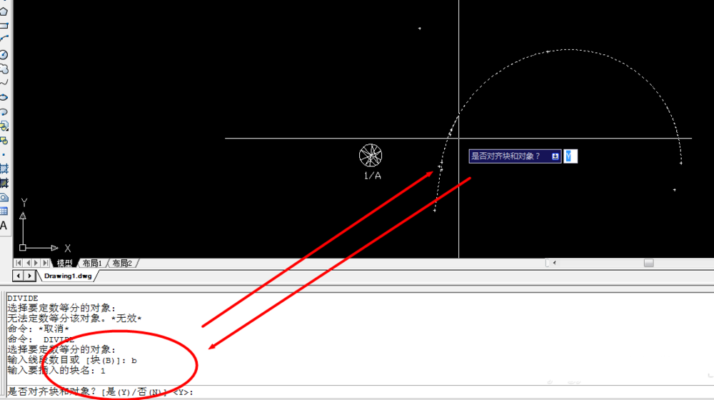 3、點擊路徑線條,輸入字母B,輸入塊的名稱,這里為“1”;