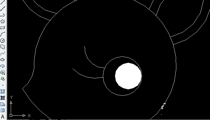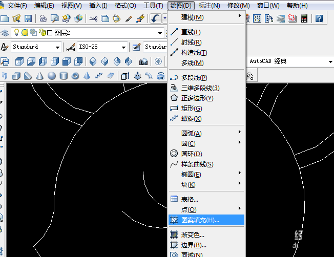 6、在大圓里面畫兩個(gè)小圓,將最小的一個(gè)填充顏色,再畫兩段圓弧為眼睫毛,效果圖如下圖一,圖案填充在“繪圖”選項(xiàng)中的“圖案填充”命令,如圖二。