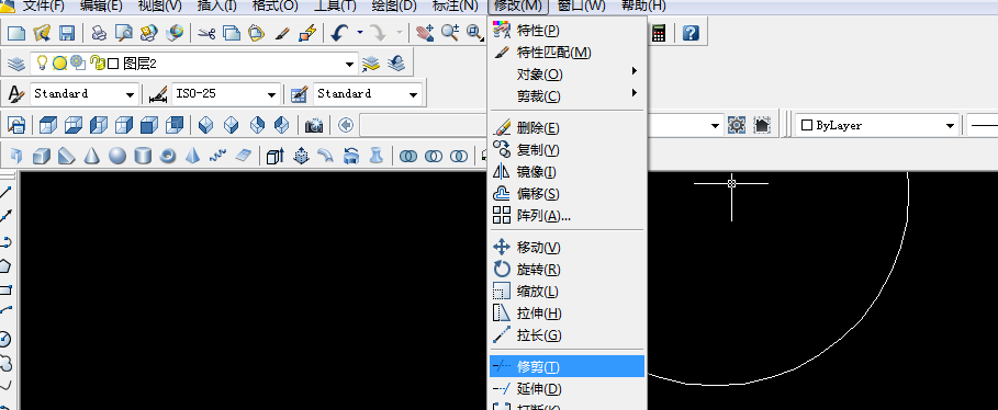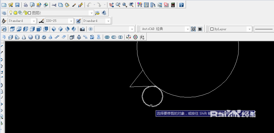 3、點(diǎn)擊“修改”中的“修剪”按鈕,如圖一;全選,然后點(diǎn)擊需要修剪的部分,如圖二;然后把上面一條線段以同樣的方式修剪,最后的效果圖如圖三。