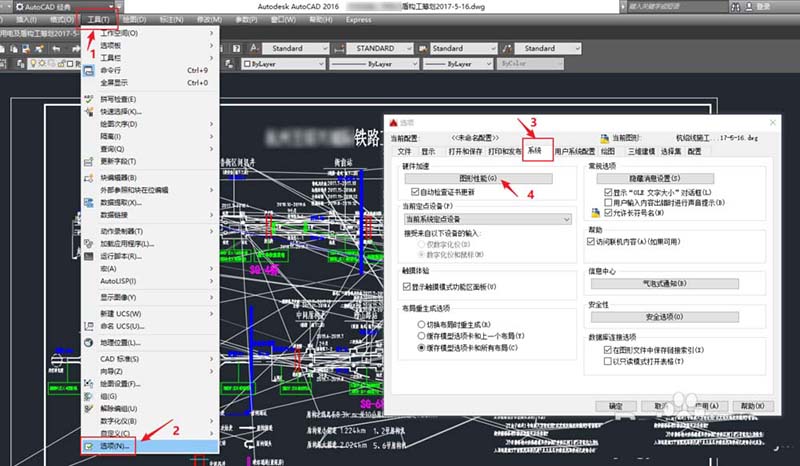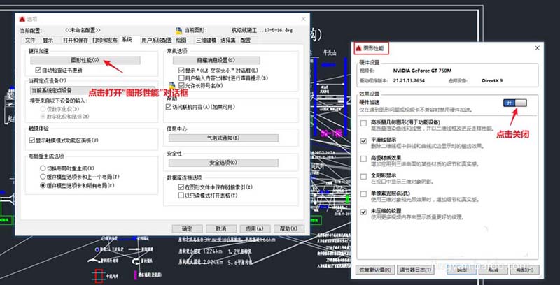 3、在選項對話框里點擊切換到“系統”標簽,再點擊左側“圖形性能”按鈕,打開圖形性能對話框,點擊硬件加速右側的開關按鈕,關閉硬件加速;