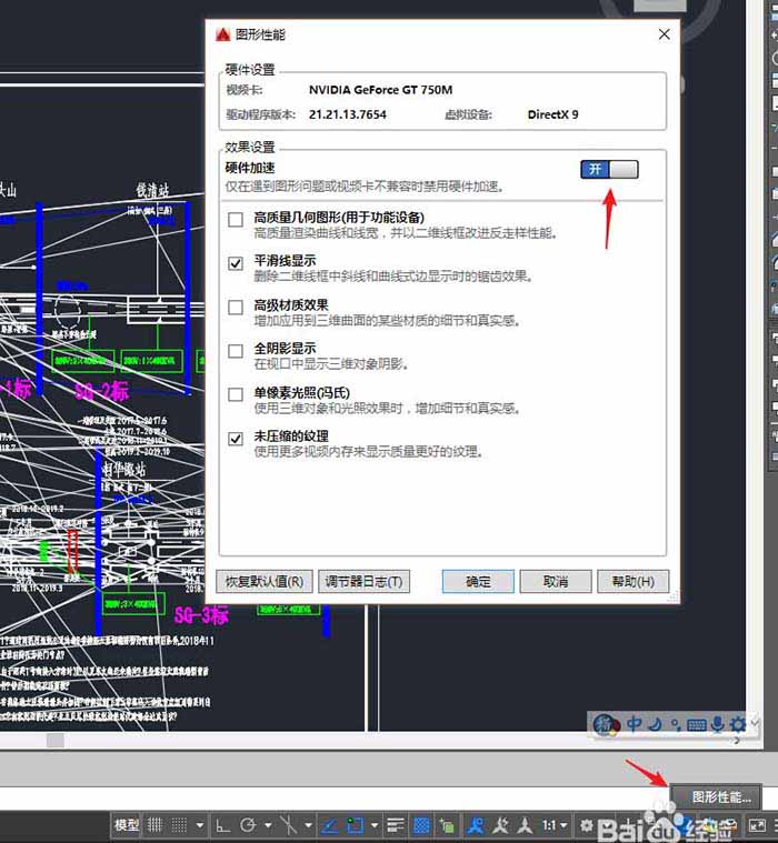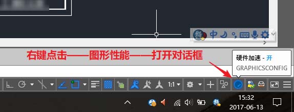 4、如果你cad沒有顯示菜單欄,也可以從界面右下角工具欄里打開硬件加速的對話框來設置,右鍵點擊速度表按鈕——出現圖形性能按鈕——點擊打開對話框;