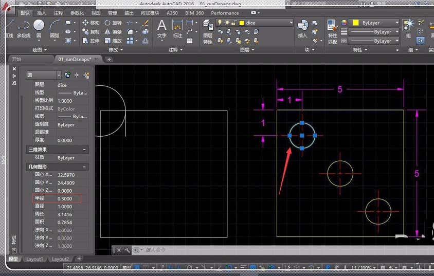 5、選中圓下看圓的屬性半徑為0.5,我們也畫0.5半徑的圓