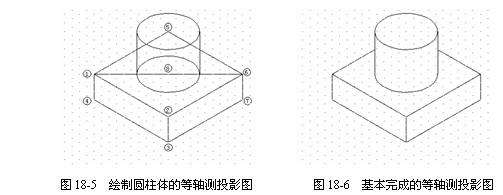 (1) 切換到上軸測面,利用端點捕捉,用直線將點①和點⑥連接起來(參看圖18-5)。這條線是為確定圓柱底面中心點而作的輔助線。