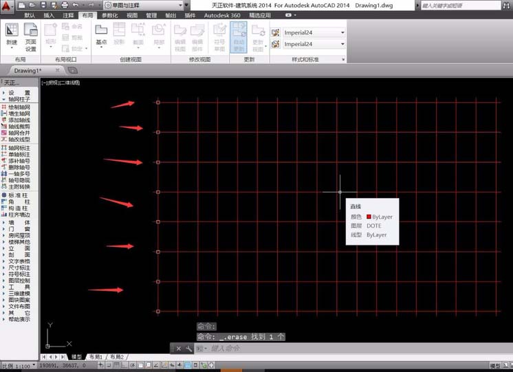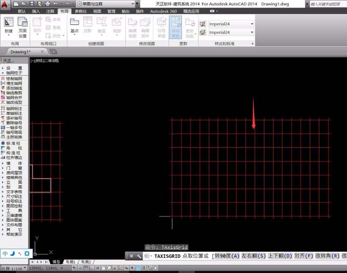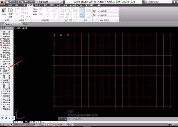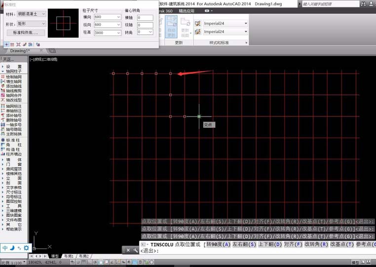 8、如果我們需要在大范圍進(jìn)行柱子的放置,一個一個的放置會導(dǎo)致操作量大大增加,此時我們可以先對一排軸線進(jìn)行柱子的放置。