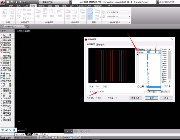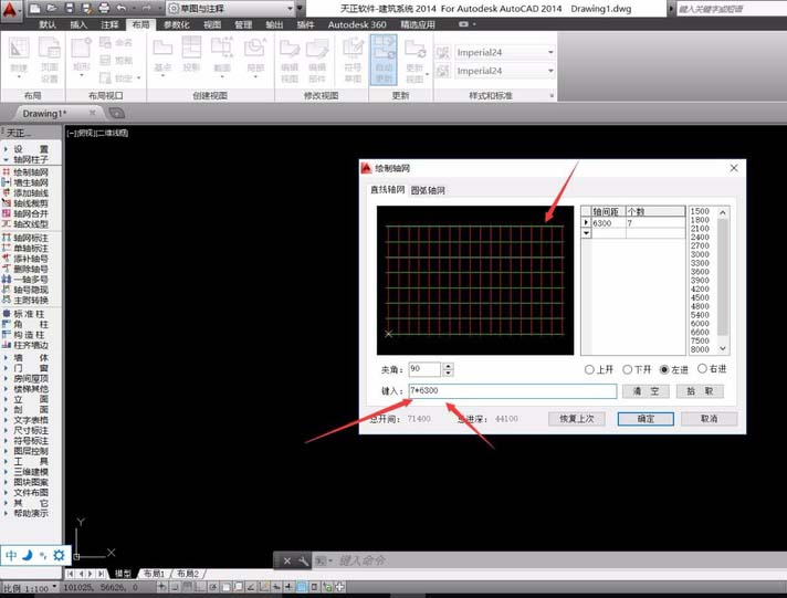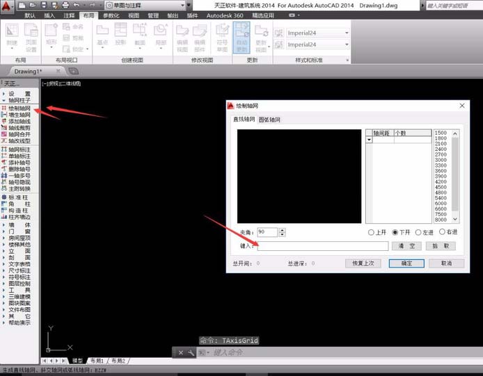 4、我們也可以在下方的“鍵入”中輸入數(shù)量和距離,“軸線數(shù)量*軸網(wǎng)距離”,這樣也可以直接繪制出相應(yīng)數(shù)量的軸線,這樣就可以快速繪制較為復(fù)雜的軸網(wǎng)。
