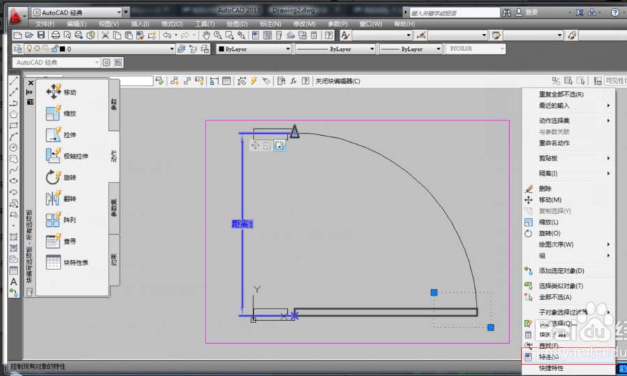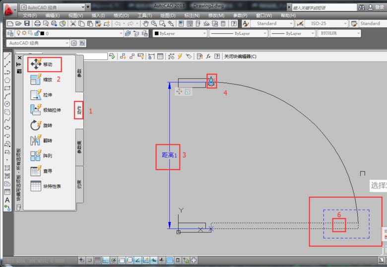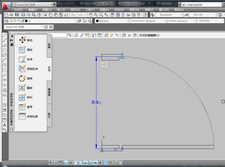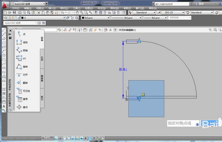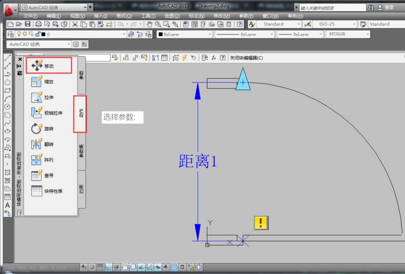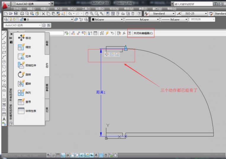 6、在“塊編寫選項板”中的“動作”選項中選擇“移動”項,然后根據命令行提示,在選擇參數時,選擇已經創建的線型(距離1),系統提示“選擇對象:”時,選擇門框對象,按空格鍵確定,從而形成了一個移動圖標,表示創建好了移動。如圖所示。