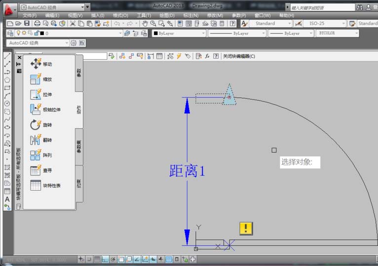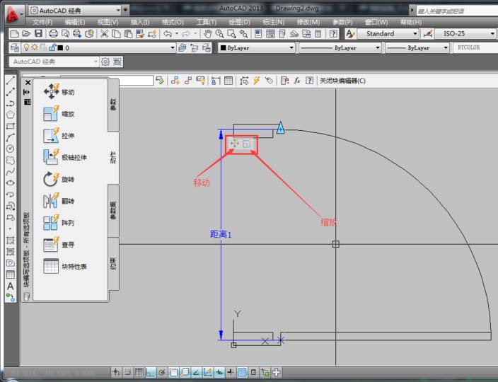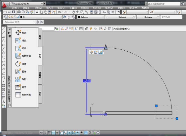 7、在“塊編寫選項板”中的“動作”選項中選擇“縮放”項,然后根據命令行提示,在選擇參數時,選擇已經創建的線型(距離1),系統提示“選擇對象:”時,選擇開門弧型對象,按空格鍵確定,從而形成了一個縮放圖標,表示創建好了縮放。如圖所示。