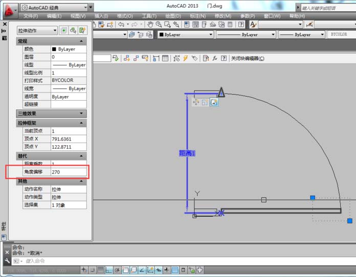 9、選擇形成了一個拉伸圖標,在空白處點擊鼠標右鍵選擇“特性”。如圖所示。修改"角度偏移"值:270,如圖所示。