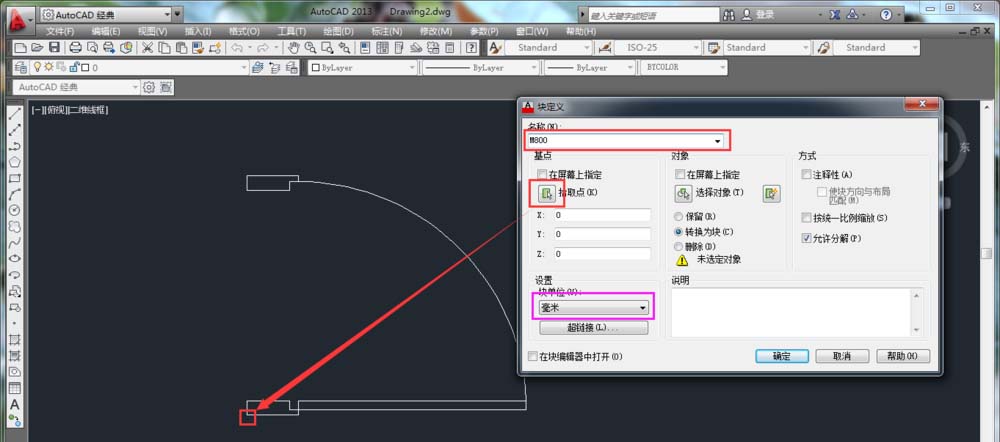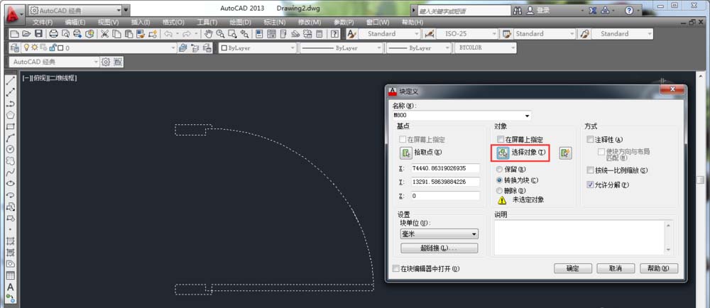 2、刪除標注。執行“創建塊”命令(B)/“繪圖”---“塊”---“創建”。將門對象創建為圖塊,創建圖塊的名稱為“M800”。點擊“確定”塊就創建完成了。