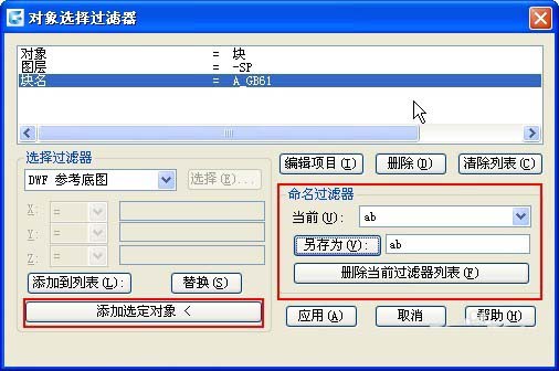 2、命令選擇過濾器的設置更豐富和靈活,有些人更喜歡用這個命令,例如上面的條件中有“圖層=-SP”,圖塊選擇的結果就跟選擇相似對象一樣,如果將圖層條件刪除,選擇結果就跟快速選擇一樣。這里選項比較多,就不一一介紹了,大家如果感興趣,可以自己研究一下。