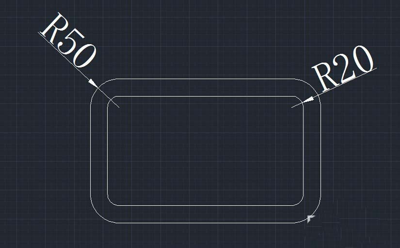 4、執行圓角命令(F),根據命令行提示,選擇“半徑(R)”選項,再輸入半徑為50mm,然后分別選擇外側矩形的二條交叉線進行圓角,用同樣的方法再次設置半徑為20mm,對內矩形進行圓角操作。