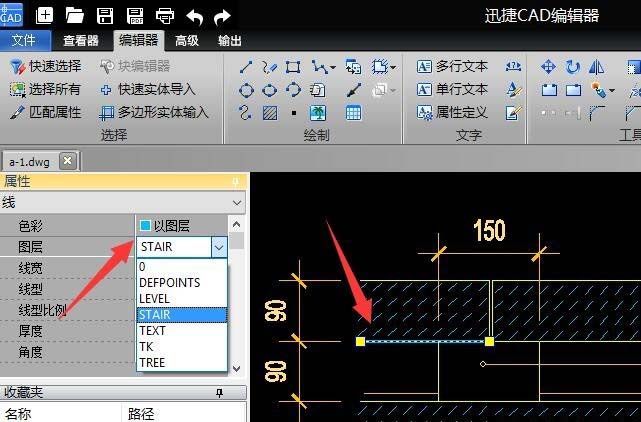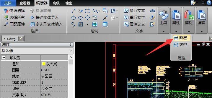4、為了查看CAD圖紙中線條顏色所代表的具體含義,我們可以切換到“編輯器”功能區(qū),點(diǎn)擊“屬性”列表中的“圖層 ”按鈕。