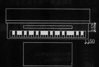 4、執行“矩形”命令(rec),繪制一個1422mmX127mm的直角矩形,執行分解命令(X)將直角矩形對象進行找散操作;再執行“偏移”命令(O),將豎線依次向右偏移44mm的距離,從而完成鋼琴輪廊的繪制。