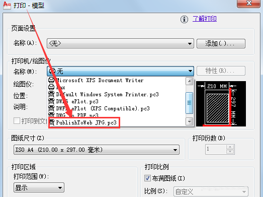 Ctrl+P或plot命令打開【打印】窗口,在【打印機/繪圖儀】中選擇“PublishToWeb JPG.pc3”,然后選擇圖形區域打印。