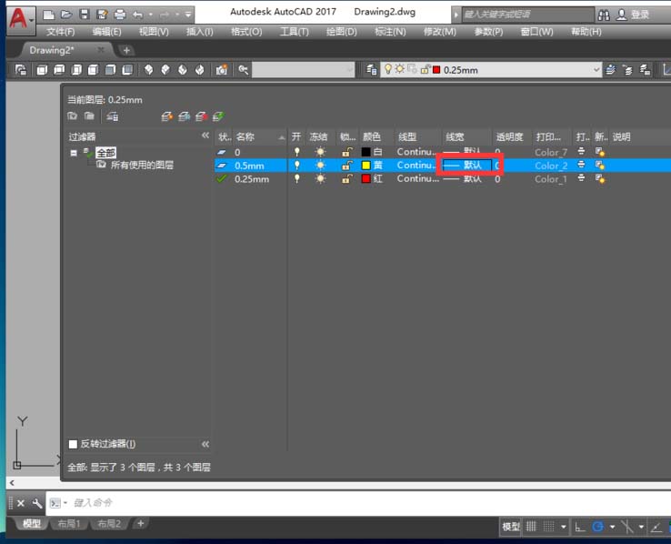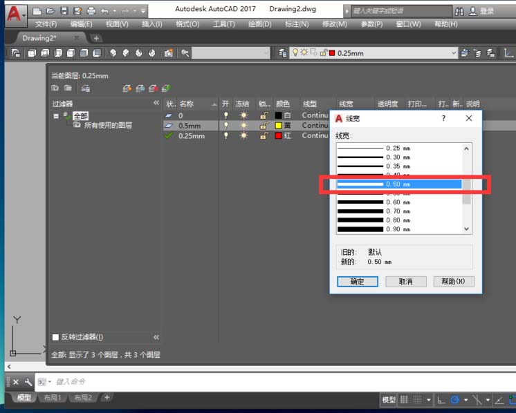 2、然后,我們再設置一個“0.5mm”的圖層,修改完顏色之后,點擊“線寬”下的“默認”。