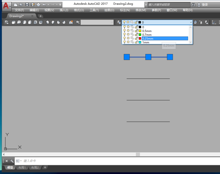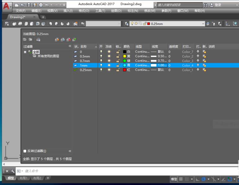 4、按照同樣的方法,在圖層管理器中,新建四個圖層,分別為0.25mm,0.5mm,0.7mm,1mm,并設置相應的線寬。