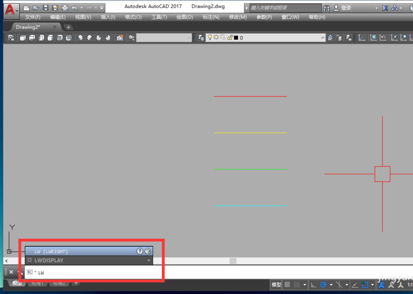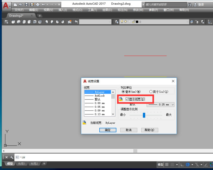 7、命令“LW”,打開“線寬設置”窗口,將“顯示線寬”勾選中,確定,然后退出。