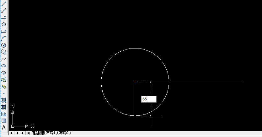 3、以長度為63的線段的一個端點為圓心,畫一個半徑是65的圓。如下圖