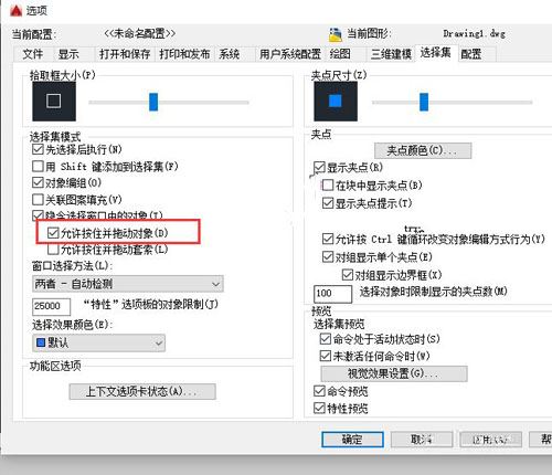 7、我們也可以更改寬選方法為矩形框選,在菜單欄選擇“工具”-“選項”按鈕,在打開的“選項”對話框中切換到“選擇集”選項,勾選“允許按住并拖動對象”選項,如圖所示。