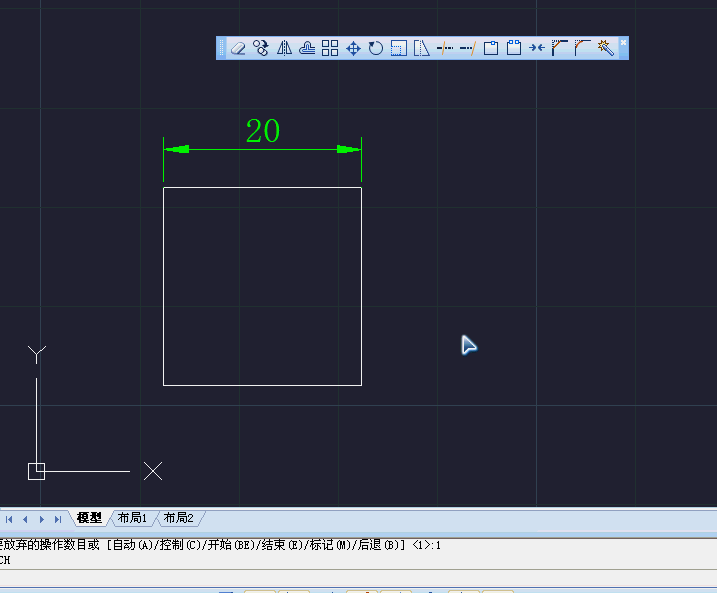 2、比如要拉伸這個(gè)正方形。將長度拉伸得到40。注意,四邊形不是一個(gè)整體,使用矩形命令繪制是一個(gè)整體,所以要直線繪制的矩形。點(diǎn)擊拉伸命令,選擇上下邊,和右邊一條邊然后回車,點(diǎn)擊右邊端點(diǎn)移動鼠標(biāo),輸入20回車。得到圖2.