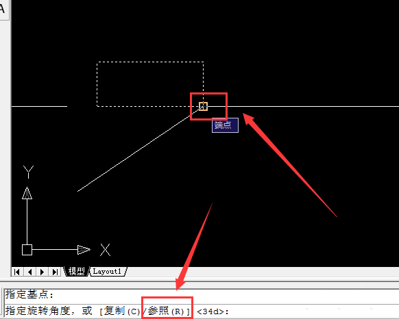 2、然后選中一個基點,如圖所示,命令版上會出現(xiàn)命令,我們選擇R,空格,如圖所示