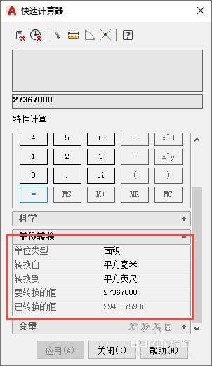 3、在特性面板中單擊面積文本框,后面會出現一個計算器圖標,單擊此圖標,可以打開CAD自帶的快速計算器,如圖所示。