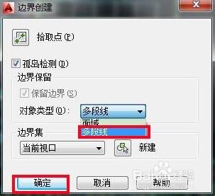 3、回車,這時,彈出邊界創(chuàng)建的對話框,我們在對象類型里選擇多段線,然后確定。