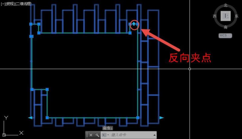 2、如果你的CAD版本比較低,你打開這張圖紙可能只會看到一個夾點,如果你的圖紙版本夠高,比如說2012以上的,你會看到圖塊邊界上有很多夾點,上面還有藍色的向下的箭頭形的夾點。