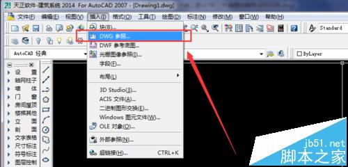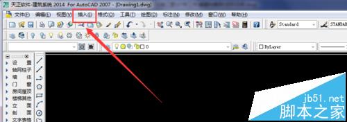 2、首先打開你要插入參照的cad圖形,然后在cad命令版上找到插入,如圖所示