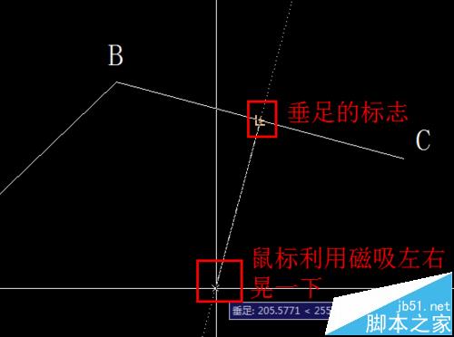 2、使用快捷鍵“L”直線命令,選擇第一個點時,選擇BC的中點;然后在垂直方向左右晃動鼠標會有如圖所示的“垂足”出現,左擊選擇第二個點,OK!