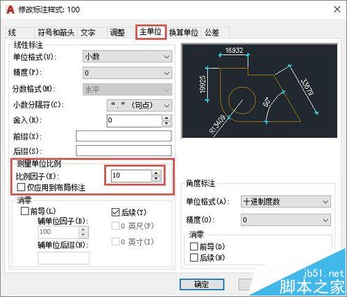 2、單擊“主單位”選項(xiàng)卡,找到測(cè)量單位比例,將比例因子設(shè)置為10,如下圖所示。