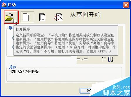 2、在我們啟動(dòng)CAD時(shí)會(huì)自動(dòng)新建一個(gè)文件,而且也會(huì)出現(xiàn)上面的對(duì)話框,但對(duì)話框名稱變成了“啟動(dòng)”,而且第一個(gè)“打開(kāi)文件”的選項(xiàng)卡被激活了,如下圖所示。