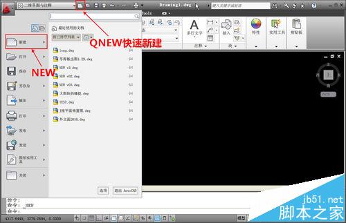 3、注意我們?cè)O(shè)置的是快速新建的默認(rèn)樣板文件名。CAD內(nèi)部新建是有兩個(gè)命令的,一個(gè)是NEW,一個(gè)是QNEW(快速新建),我們?cè)诠ぞ邫谥悬c(diǎn)新建按鈕時(shí)可以看看命令行執(zhí)行的是QNEW,但在文件下拉菜單中執(zhí)行的是NEW命令。我們?cè)O(shè)置了默認(rèn)模板只對(duì)QNEW起作用,執(zhí)行NEW命令時(shí)仍會(huì)彈出選擇樣板的對(duì)話框。
