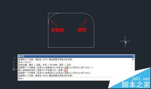 1、我們可以看到圓角有一個修剪參數T,默認狀態下,在生成圓角的同時會對選擇的編輯進行修剪或延伸的操作,但如果有特殊需要的話,可以設置不修剪,生成圓角但保留原始線,如下圖所示。