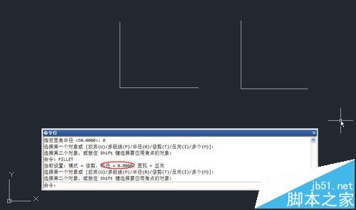 2、輸入F,回車,輸入R,回車,如果半徑不是0,輸入0,回車,分別單擊兩條直線要保留的部分,回車,重復圓角命令,單擊另外兩條直線,如下圖所示。