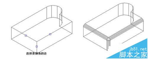 1、圓角命令不僅可以對二維線形進行倒角,也可以對三維實體進行倒角。當選擇三維實體上需要倒角的邊時,會提示輸入圓角半徑,輸入半徑后可以選擇一條或多條邊同時倒圓角,如下圖所示。