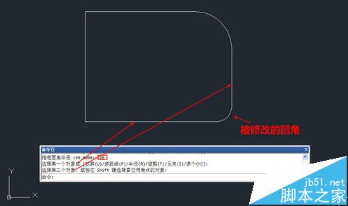 4、回車,重復命令,直接選擇矩形的另外兩條相鄰邊,創建一個新的圓角,如下圖所示。