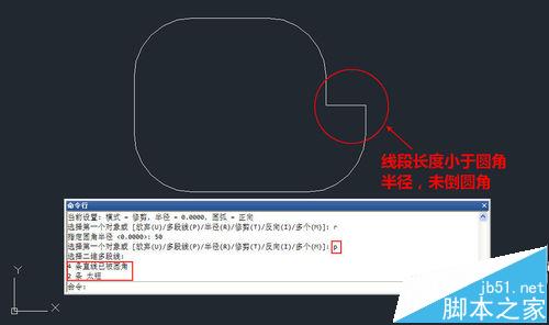 3、線段長度小于圓角半徑時無法生成圓角,命令行會告訴我們生成的圓角數量和未生成圓角的數量。