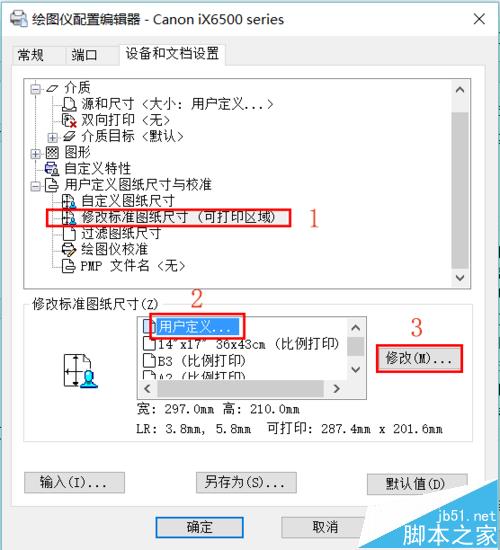 2、彈出“繪圖儀配置編輯器”窗口,依次單擊“修改標準圖紙尺寸”——“用戶定義”——“修改”。