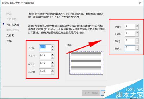 3、彈出“自定義圖紙尺寸窗口”,將“上”“下”“左”“右”的值都修改為零,單擊“下一步”。