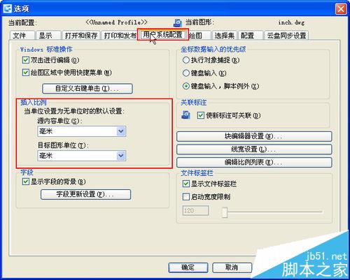 5、我們這次看到了單位的設置,當圖紙作為圖塊或外部參照(XREF)插入到其他圖紙中時,如果兩張圖紙的單位不一致,可以通過設置單位來自動進行這種單位的轉換。這就是UNITS單位設置的最主要作用。當然不設置UNITS單位,我們也可以在選項對話框直接設置源圖紙和目標圖紙的單位來控制這種尺寸轉換,如下圖所示。