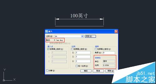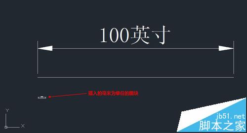 4、注意看上面的對話框右下角的塊單位,可以看到單位是mm,而比例是0.0394,我們點確定按鈕,將圖塊插入到圖中100英寸長的直線下方,看一下插入的效果,如下圖所示。