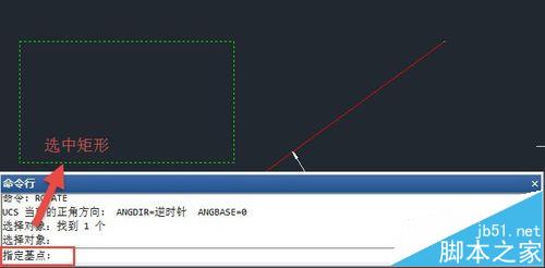2、軟件提示選擇旋轉的基點,我們拾取傾斜直線左下方的斷點作為旋轉的基點,此時拖動鼠標,矩形會繞基點旋轉,如下圖所示。