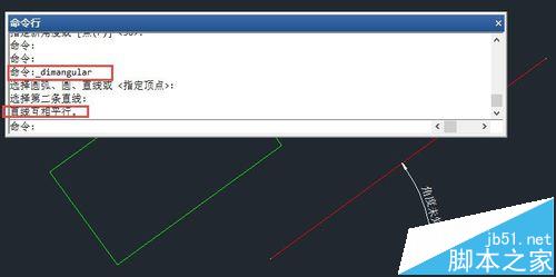 5、為了驗證矩形是否平行,我們可以用角度標注來標注一下矩形底邊和直線的角度,可以看到命令行會提示這兩條線是平行的,如下圖所示。