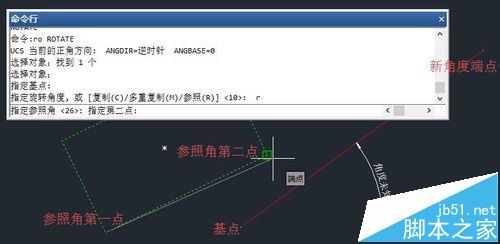 1、上面只是介紹了旋轉的參照參數的一種應用,被旋轉的圖形是水平的,因此在輸入參照角度的時候可以直接回車用默認的0度,如果矩形也是傾斜的,此時參照角度就需要輸入矩形的傾斜角度,如果矩形的傾斜角度也未知,在設置參照角時就需要捕捉矩形的兩個點來確定了。但在設置參照旋轉時新角度時第一點會用旋轉基點,因此基點還必須選擇直線的端點,如下圖所示。
